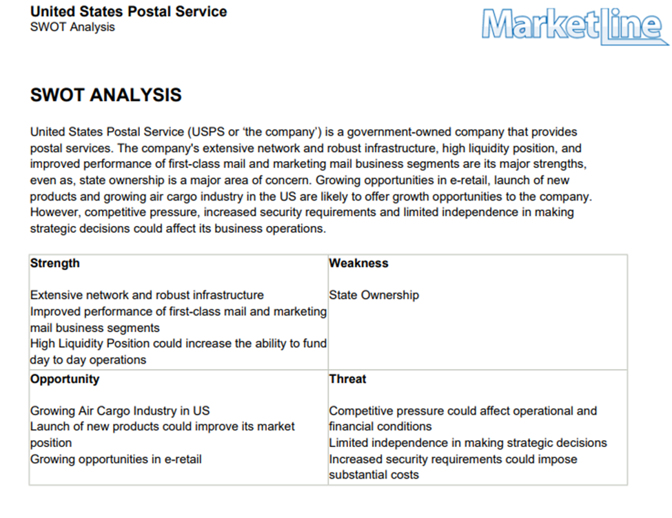 United States Postal Service SWOT Analysis. (2022). United States Postal Service SWOT Analysis, 1–7.