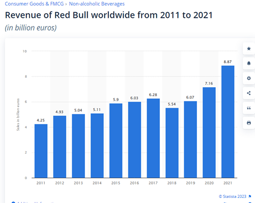 Red Bull’s revenue has experienced a significant increase over the years. In 2021, its global revenue amounted to about 8.87 billion euros worldwide. This growth in revenue indicates the company’s strong position in the energy drink market and its ability to generate substantial profits. Red Bull’s prominence as the leading energy drink brand in the United States further solidifies its success and market presence. (Ridder, 2022). Statista also found that Red Bull surmounted nearly 109% of their original revenue stream from 2011.